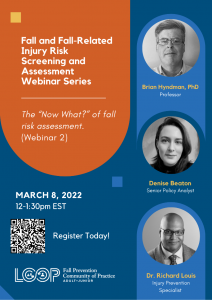 March 8, 2022, from 11:12:30pm CST: Fall and Fall-Related Injury Risk Screening and Assessment Webinar Series: the “Now What?” of fall risk assessment (Webinar #2)