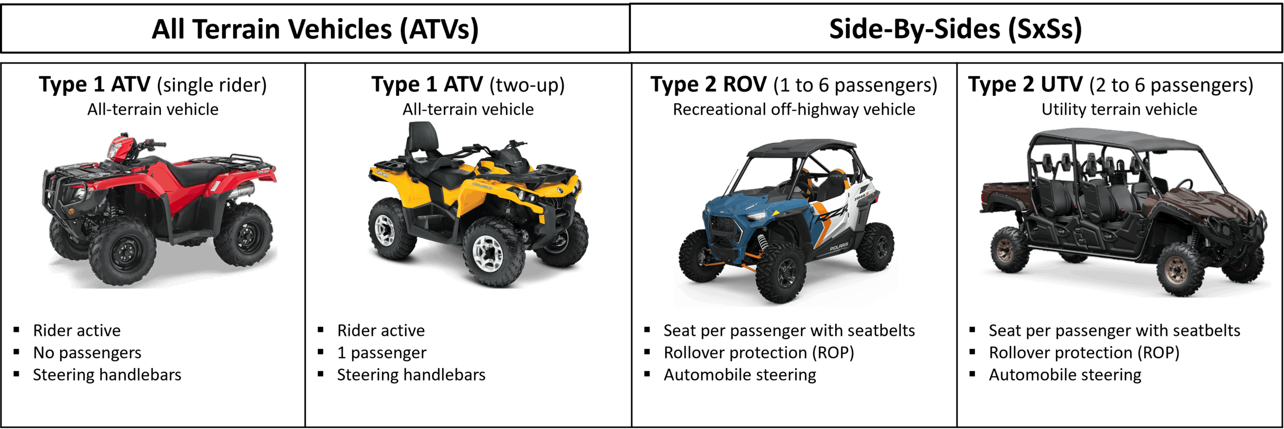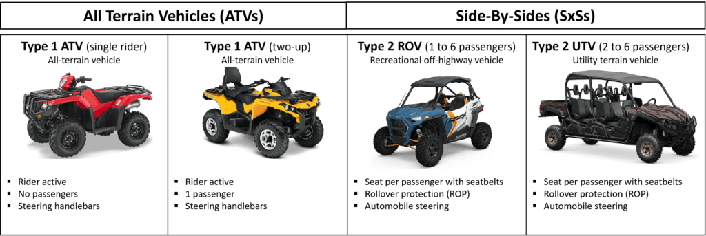 Off-road vehicles (ORVs) are motorized vehicles designed to handle rough terrain. They include all-terrain vehicles (ATVs) and side-by-sides (SxSs), which can be either a utility terrain vehicle (UTV) or recreational off-highway vehicle (ROV) (See figure 1).